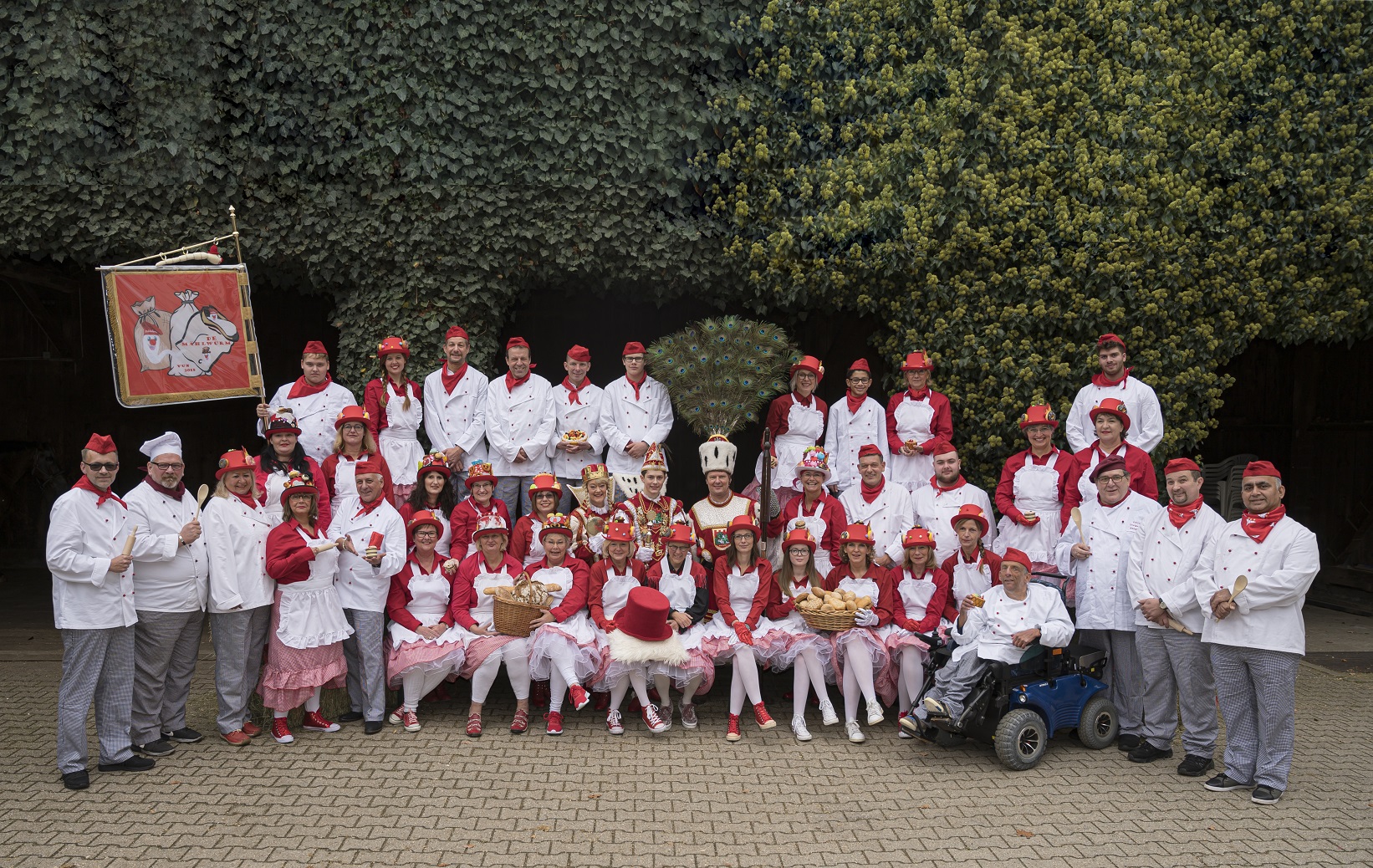 Reihe mit dem Dreigestirn v.l.n.r.: Susi Bauer, Susanne Winterscheidt, Andrea Semrau, Jungfrau Petra, Prinz Mike I., Bauer Jochen, Ela Kastl, Micha Bauer, Maxim Schneider